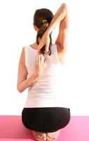 Stretch your right arm up, bend your elbow and drop your hand down the back of your neck- Now reach up behind your back with your left hand, reaching as high as you can so the fingers of both hands meet. If they don't touch, try holding a yoga belt with your right hand reaching for the belt with your left hand, working your hands as close together as you can without straining
